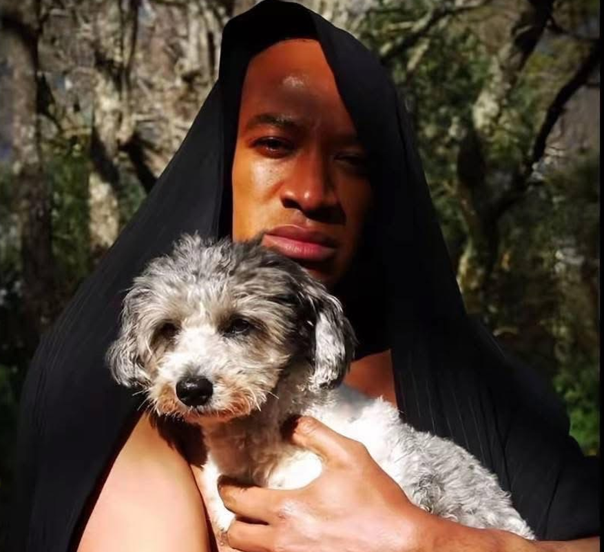 Portrait de l’artiste tenant son chien « Mitou » symbole de tendresse et de simplicité, lors d’une prise de vue en extérieur.